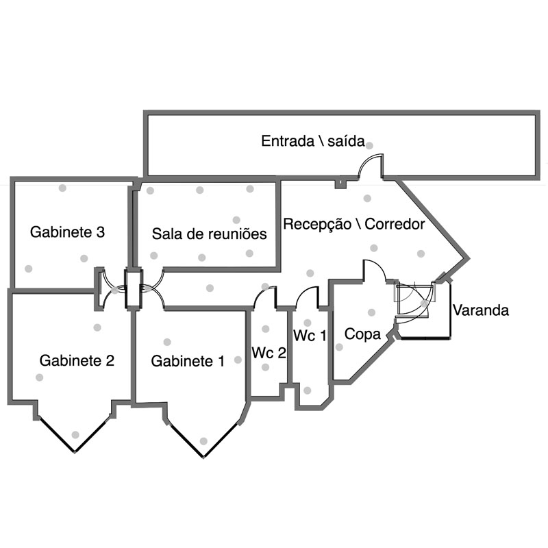 Os gabinetes estão preparados para receber 2 ou 3 postos de trabalho, e contam com as seguintes áreas respectivas: Gabinete 1 - 18 m2; Gabinete 2 - 18 m2; Gabinete 3 - 20 m2.
